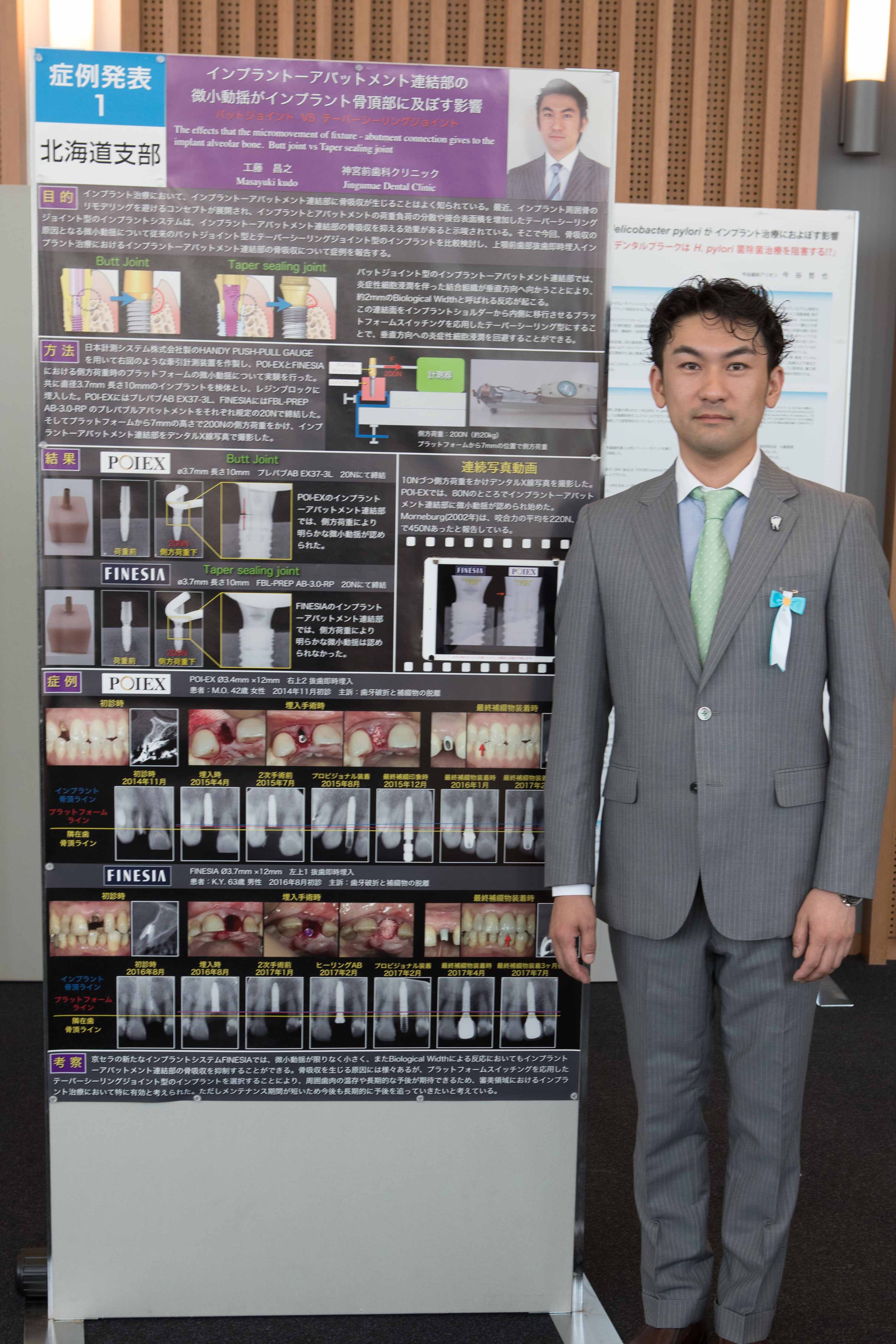 16 July 2017近未来オステオインプラント学会総会 工藤先生、見事最優秀賞 7月15日(土)総会・懇親会〜7月16日(日)学術大会(10周年記念大会)が東京で開催された。 今年は昨年惜しくも優勝を逃した工藤先生が支部代表としてポスター発表。POIの新/旧システムインプラントを比較した実験と、旧システムと新システムの症例を比較したすばらしい発表。見事、最優秀賞を獲得、昨年のリベンジをはたされました。 工藤先生、最優秀賞おめでとうございます。
