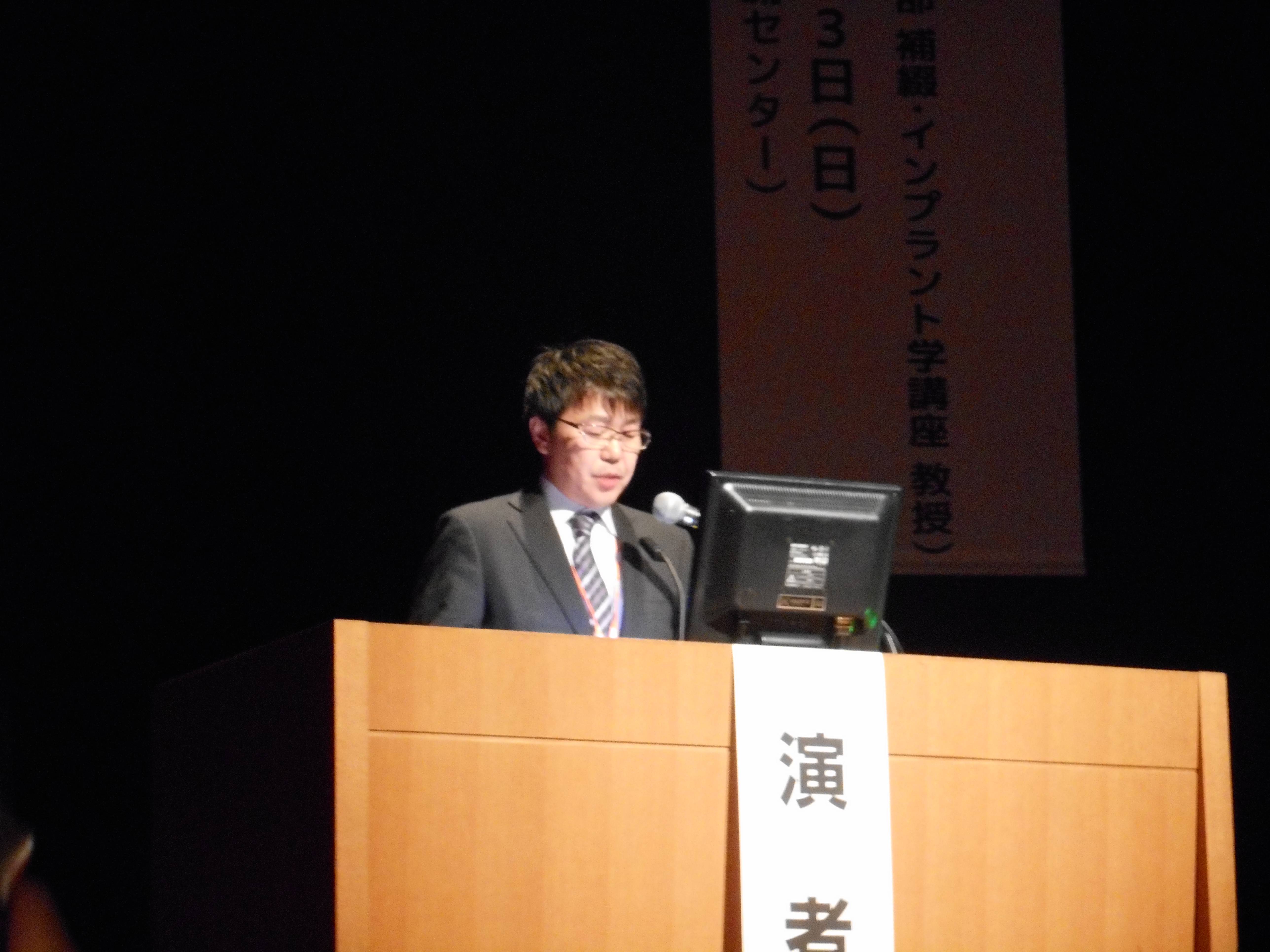 15 November 北日本口腔インプラント研究会 コロキウムにて 午前中の講演の座長として柳先生(滝川市開業)が登壇。相変わらずいろんなところに引っ張りだこですね。 午後の会員一般発表で二宮先生(旭川開業)が発表。 臼歯部の咬合崩壊症例をインプラントを用いて咬合回復した症例を発表された。症例の仕上がりもさることながら、レジン系の材料とポーセレン系の材料のプラークの付着量の違いに驚かされた。北海道支部の先生方も多く参加されており、よく遊びよく学べ。 両先生、今後も頑張ってください。 座長の柳先生
