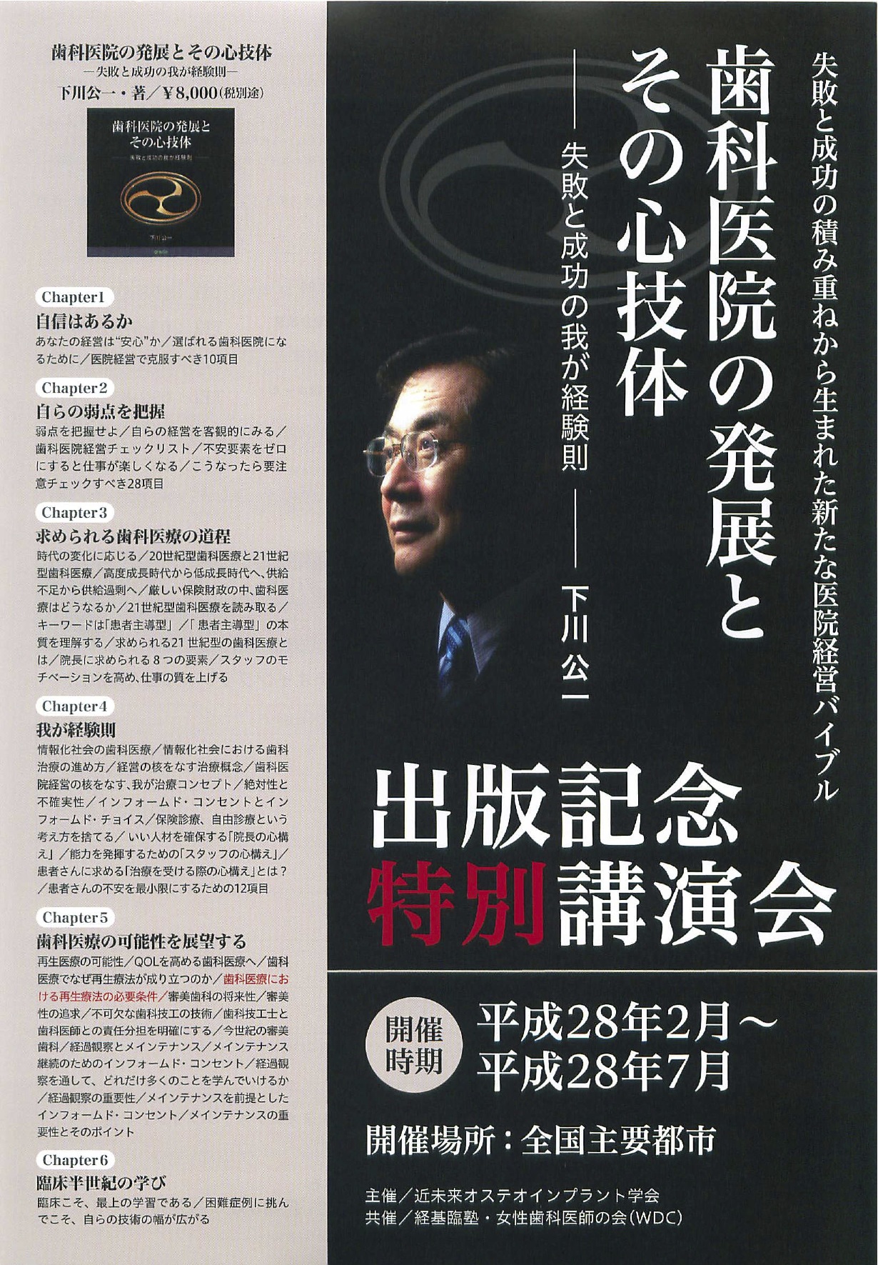 17 April 下川先生 出版記念講演 下川先生の著書「歯科医院の発展とその心技体 ー失敗と経験の我が経験則ー」の出版記念講演会。歯内療法、咬合論ほか知識や治療技術に関しては、何度も講演を聞かせて頂いてました。天才だ、と何度も思いました。 今回は、医院経営についての著書ということで、かなり興味がありました。 講演中の下川先生 座長の糸瀬先生。 下川先生が主催されている「経基臨塾」。経営、基礎、臨床、全てが医院にとって必要である、と言う意味だそうです。内容を拝見し、こと細かく医院への提言がなされている中で、印象的だったのが「自分で考え、自分の力で生きていく、そういう癖をつけなければいけない」。この言葉は、我々歯科医師だけでなく全ての人に言えることだと思い、早速スタッフにも言い聞かせています。 講演自体も経営論だけでなく、臨床にも触れ、スタッフに対してもいろんな提言をしてくださり、スタッフ連れの先生方にもとても有意義な時間となったのではないでしょうか。